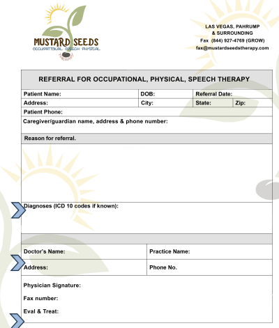 For any inquiries or to discuss a patient, call us at (702) 419-8120. You can also email intake questions or referrals to: fax@mustardseedstherapy.com.